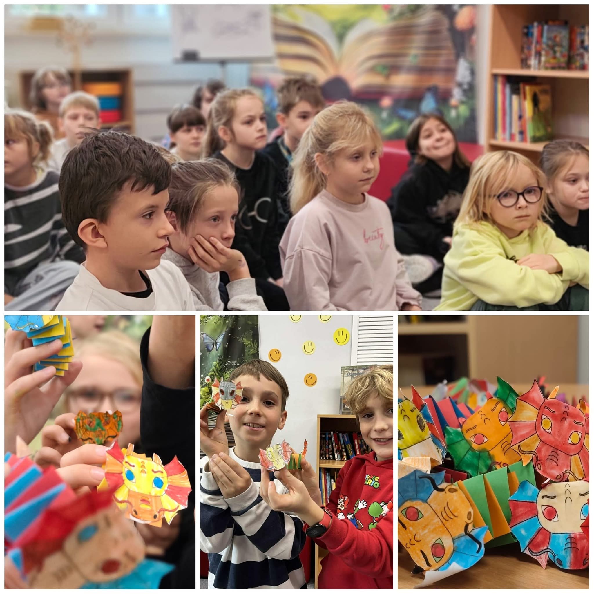 Najmłodsi uczniowie z zachwytem słuchali opowieści, a na zakończenie stworzyli własne papierowe smoki – pełne kolorów i wyobraźni.