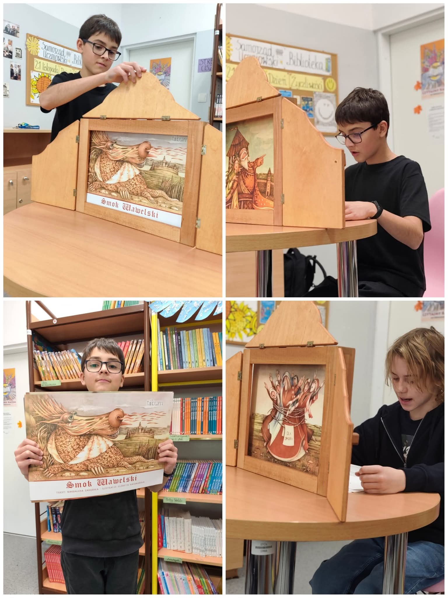 Tomasz i Marcel z klasy 6c oraz Klara z klasy 8b zaprezentowali młodszym uczniom bajkę o Smoku Wawelskim.